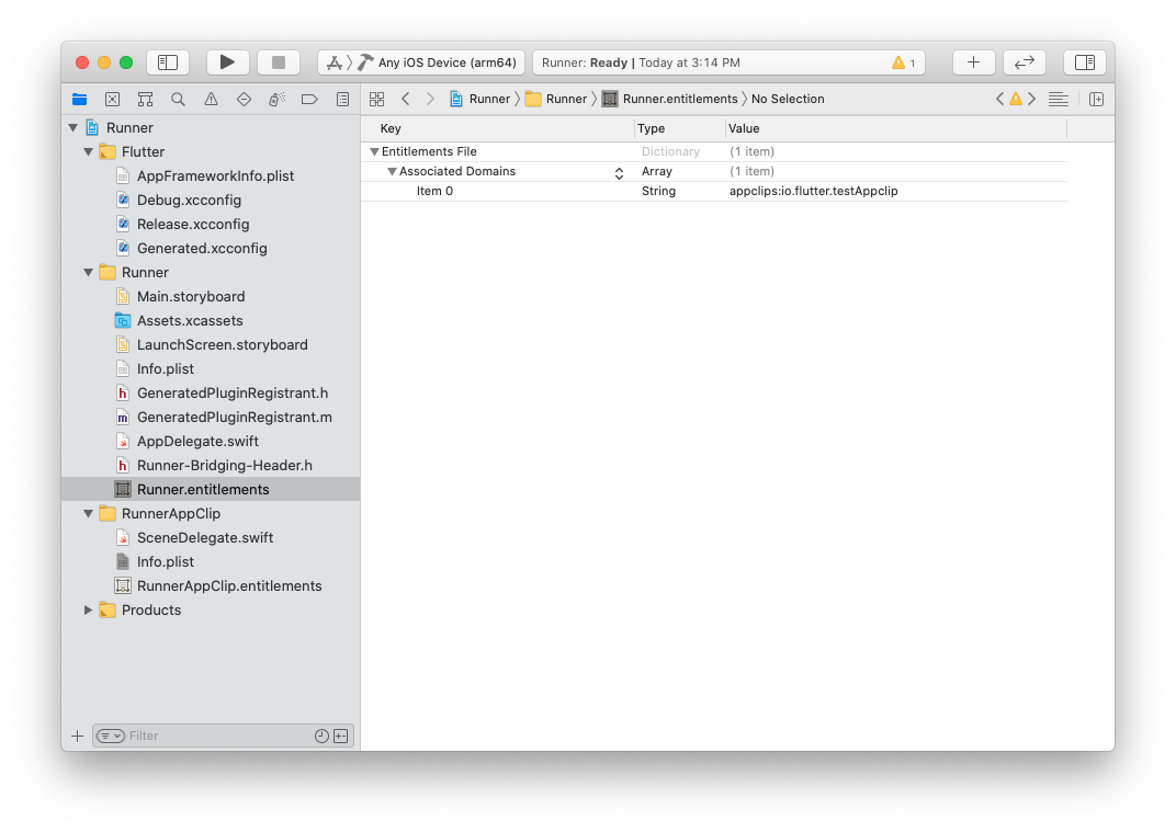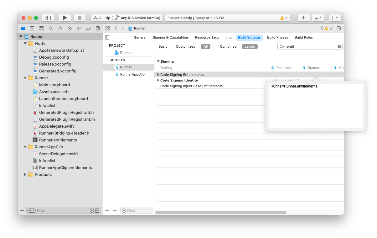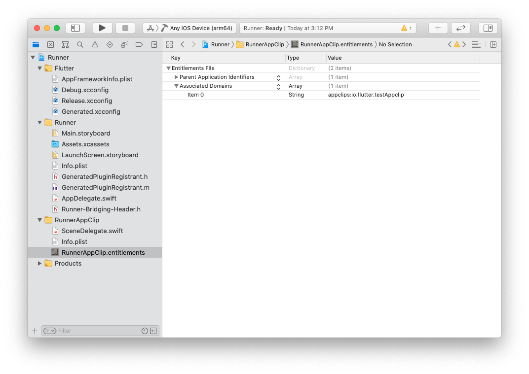 文件从 App Clip 组复制到主应用程序组,并将其重命名为与主目标相同的名称,例如 Runner.entitlements。