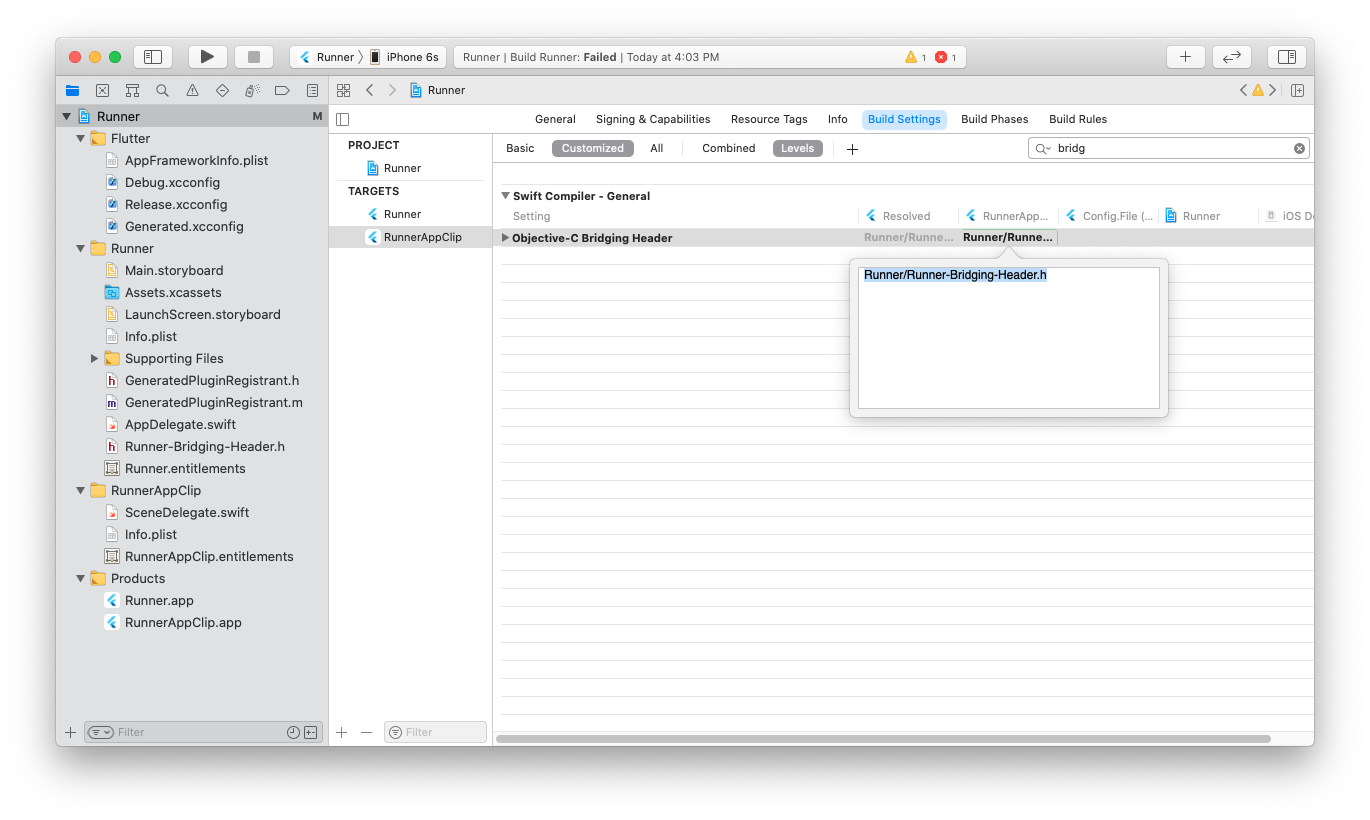 如果是 Swift target,设置 Objective-C Bridging Header 构建配置为 Runner/Runner-Bridging-Header.h。