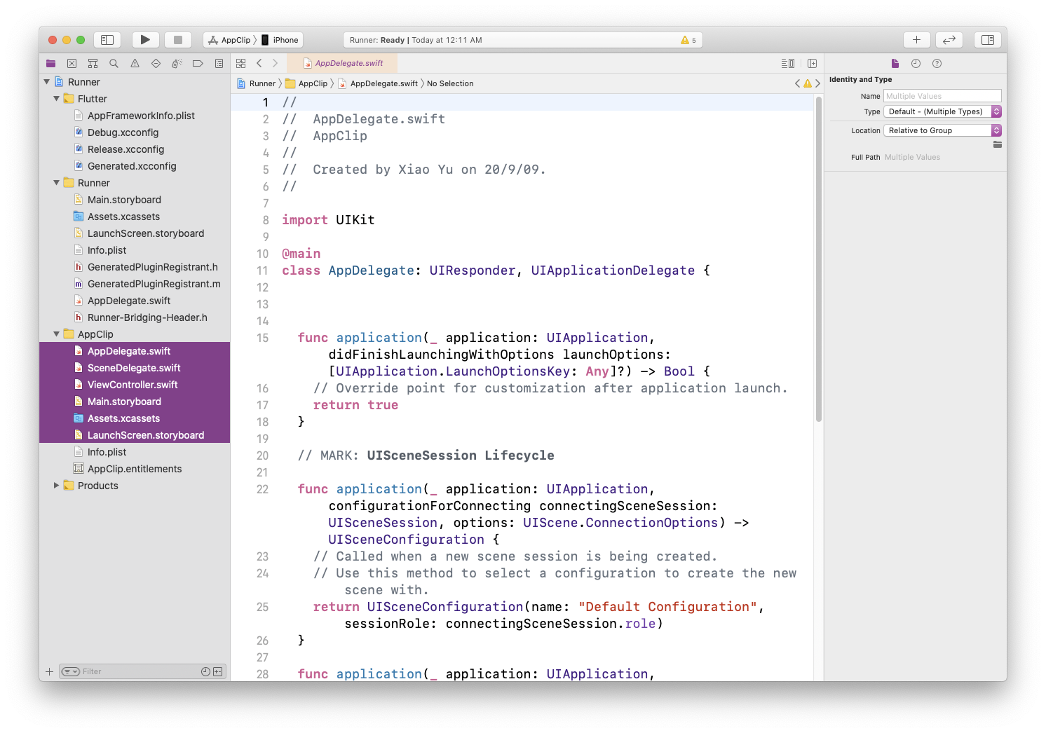 AppDelegate.swift,(如果你是 Objective-C 还应该包括 Supporting Files/main.m)选择文件并且在检查器中选择第一个选项卡,并且在 Target Membership 选中 App Clip。