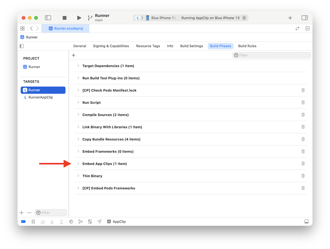 返回项目设置,打开 Build Phases 选项卡。将 Embedded App Clips 拖动至 Thin Binary 上方。