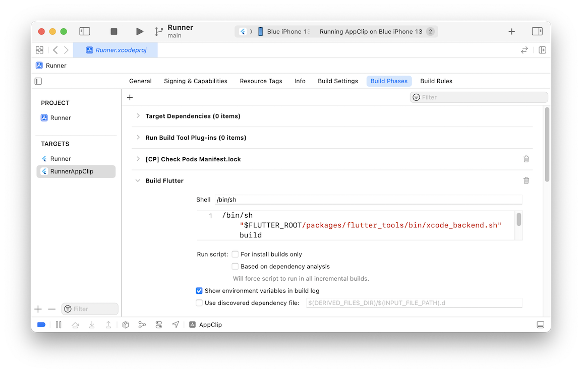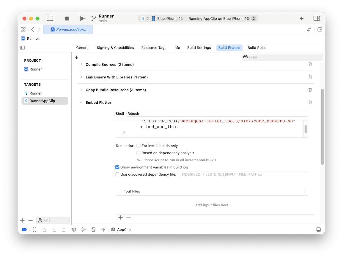 This ensures that your Flutter Dart code is compiled when running the App Clip target.